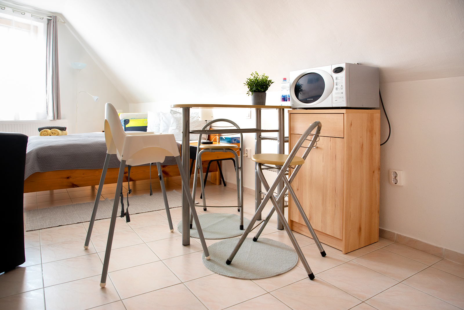 Egyszerűen berendezett, emeleti stúdió műholdas TV-vel, konyhasarokkal és kádas fürdőszobával. A szobában összesen 4 fő fér el, amelyből legfeljebb 3 felnőtt. Az apartman alapterülete 25 m2.