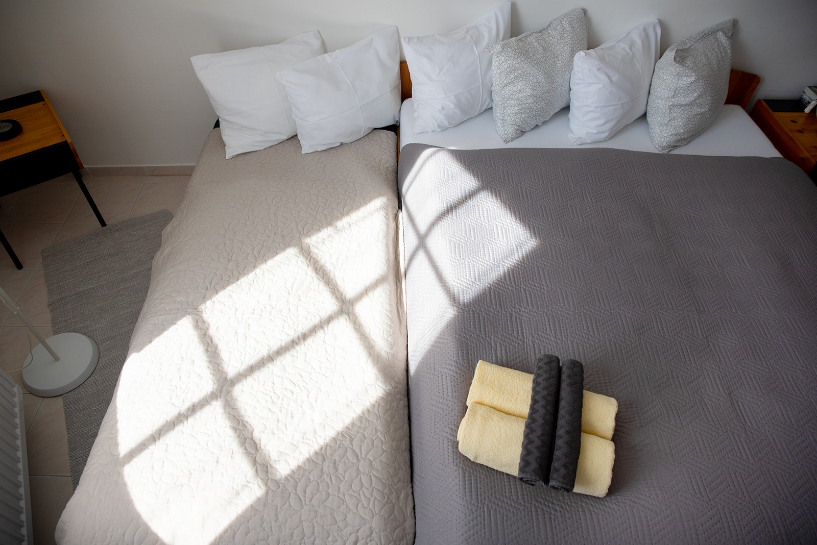 - Hálótér 2 fő részére: 2 x szimpla ágy (összetolható), ruhásszekrény, TV